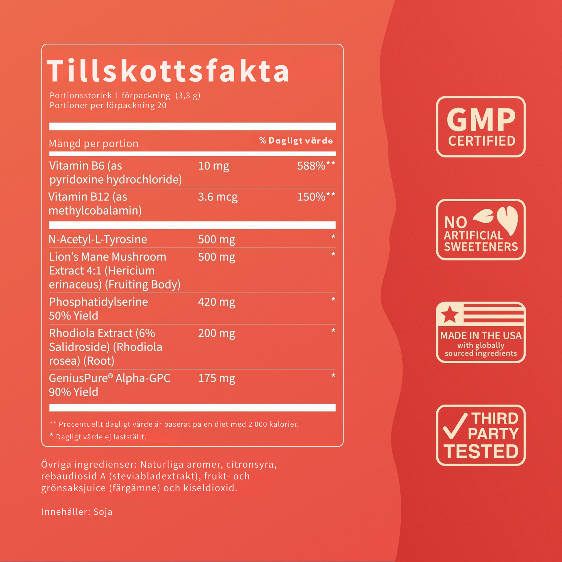 - Utan koffein – stödjer fokus och mental klarhet utan stimulans, perfekt för dig som är känslig för koffein eller vill ta den senare på dagen.